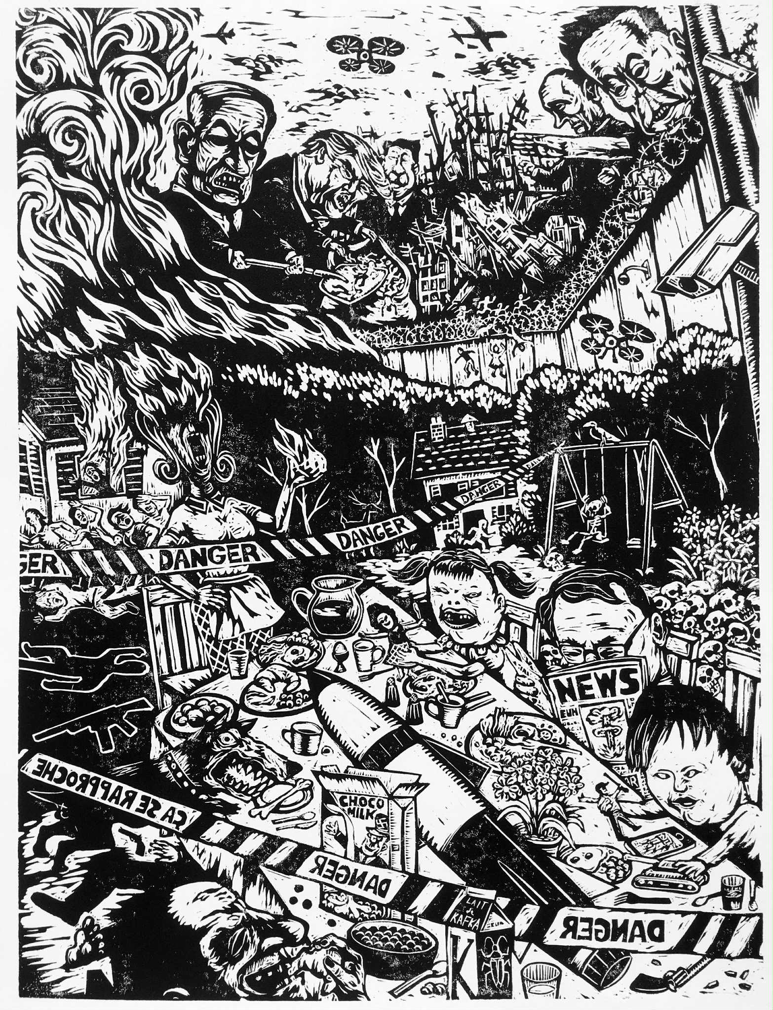 Je n’ai commencé à graver qu’en 2019, à 43 ans. Mes gravures expriment le chaos du monde contemporain et l’urgence de s’opposer au retour de l’autoritarisme et du fascisme ».