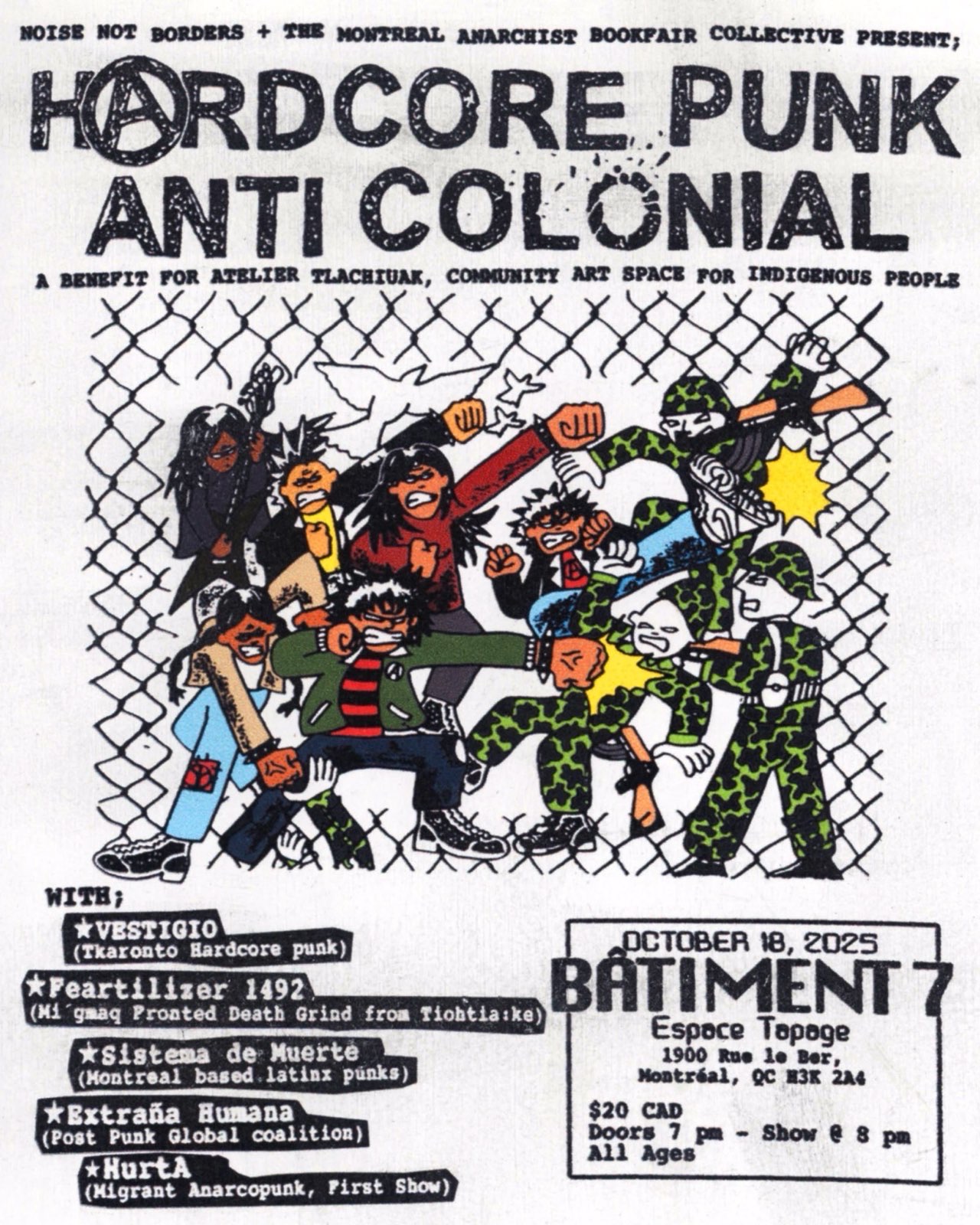 Bâtiment 7 1900 rue Le Ber,Montréal,Québec,CanadaNoise Not Borders et le collectif du Salon du livre anarchiste de Montréal présentent : HARDCORE PUNK ANTI COLONIAL Avec : Vestigio (Punk hardcore de Tkaronto)Feartilizer 1492 (Mi'gmaq deathgrind de Tiohtià:ke)Sistema de Muerte (punks latinx basés à Montréal)Extraña Humana (coalition globale post-punk)HurtA (anarcho-punk migrant, premier spectacle) 18 octobre 2025 Espace TapageBâtiment 71900, rue LeBerMontréal, QC […]