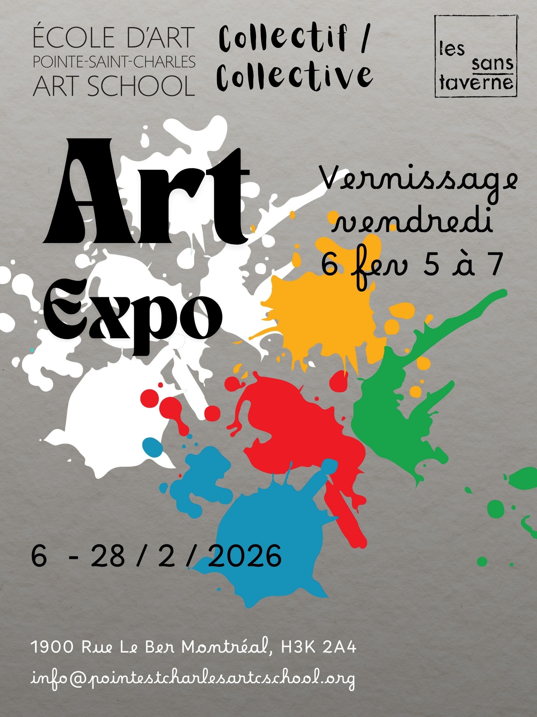 L’École d’art de Pointe-Saint-Charles apporte toute sa créativité aux sans-taverne pour une expo collective et un vernissage vibrant. Rejoignez-nous le 6 février, de 17h à 19h, pour explorer des œuvres originales, rencontrer des artistes dans une ambiance festive! - P.S. Le karaoké continue la fête juste après 1900 Rue Le Ber (les sans-taverne)