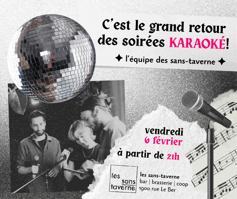 Le KARAOKÉ débarque en force aux sans-taverne le 6 février dès 21h ! Réchauffe tes cordes vocales, bouge ton groove et fais rugir ta chanson coup de cœur Animation par l’équipe de feu des sans-tav!